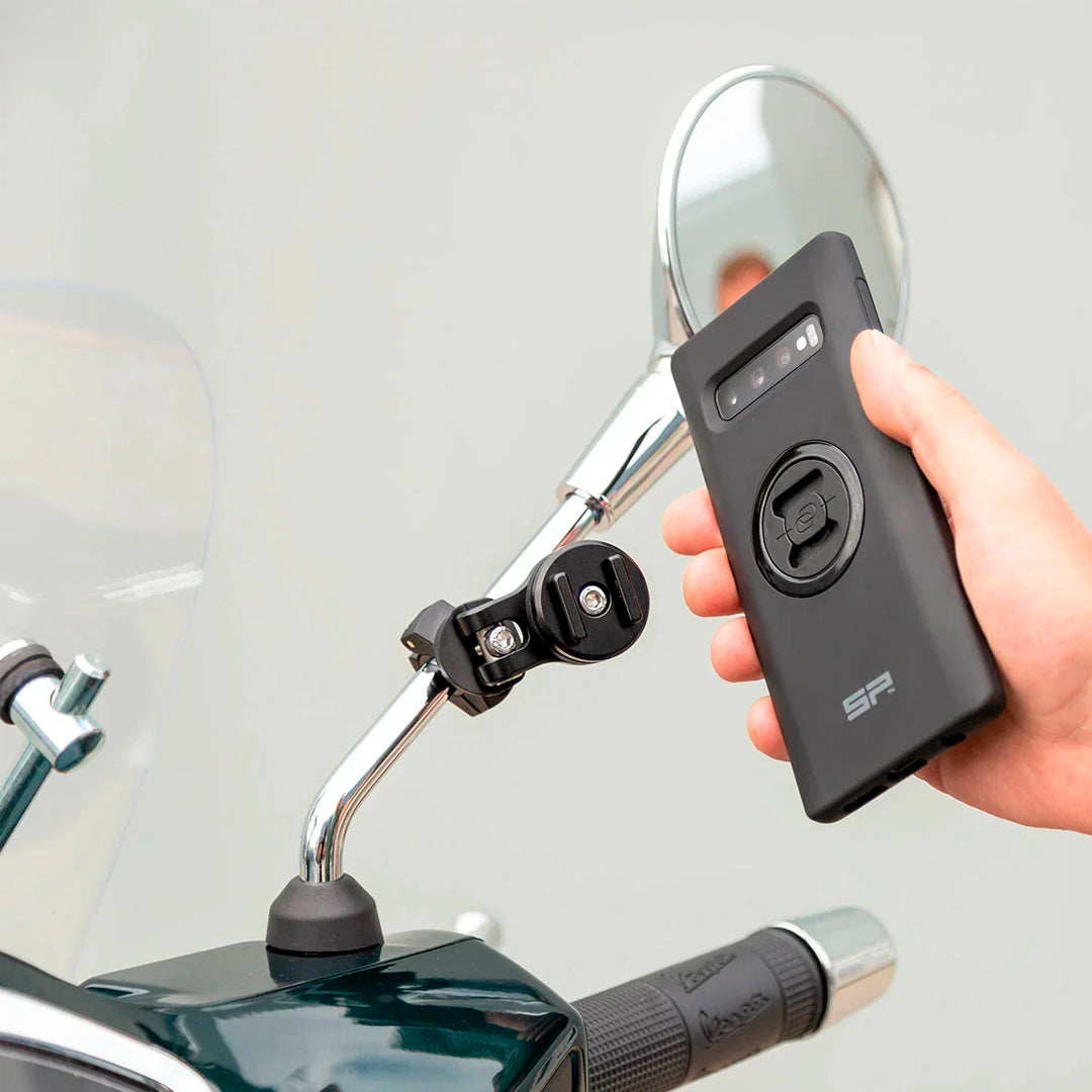 El MIRROR MOUNT PRO de SP ConnectTM le permite montar su smartphone en su motocicleta en segundos, incluso si no se puede acceder al manillar.
